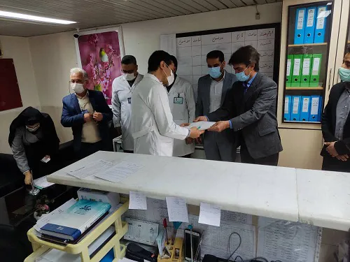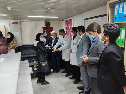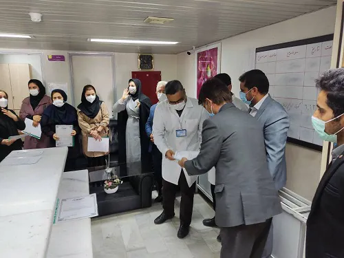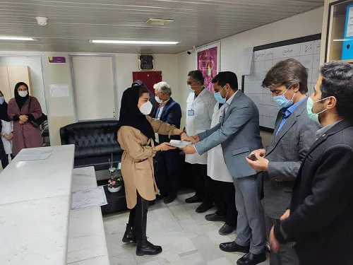 جناب آقای جعفری خیر محترم شهرستان و نماینده بنیاد برکت ستاد اجرائی فرمان امام خمینی (ر ه)، با حضور در بیمارستان خاتم الأنبیاء به مناسبت هفته پرستار از تعدادی از پرستاران برگزیده هر دو بیمارستان خاتم الانبیاء و برکت امام خمینی (ره) با اهدا 10 اصله درخت سیب مثمر به نام پرستاران تقدیر کردند.